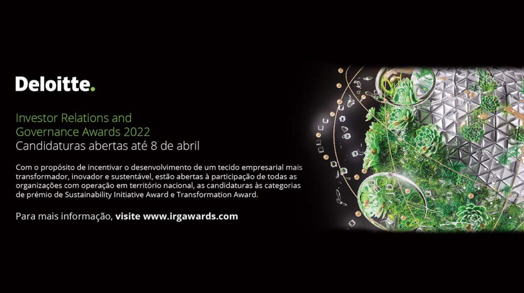 Estão abertas, até 8 de abril, as candidaturas aos Prémios Investor Relations and Governance Awards (IRGAwards), nas categorias de Transformation Award e Sustainability Initiative Award, que visam distinguir projetos com impacto no desenvolvimento do mercado empresarial português, iniciados durante o ano de 2021.