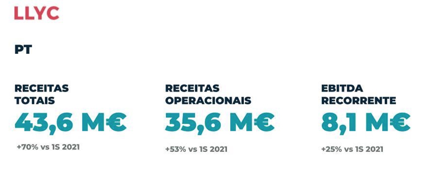 A LLYC atingiu, no primeiro semestre do ano, 43,6 milhões de euros de receitas totais. O valor corresponde a um aumento de 70% relativamente ao mesmo período de 2021, segundo o anúncio de resultados antes do relatório final do auditor. As receitas operacionais (totais deduzidos da refaturação de serviços a clientes) atingiram os 35,6 milhões de euros, um crescimento de 53%, ao passo que o EBITDA recorrente (resultado bruto da exploração) aumentou 25%, perfazendo 8,1 milhões de euros. A empresa cumpriu os objetivos estipulados no seu plano estratégico, encontrando-se muito acima dos valores do negócio pré-pandemia.