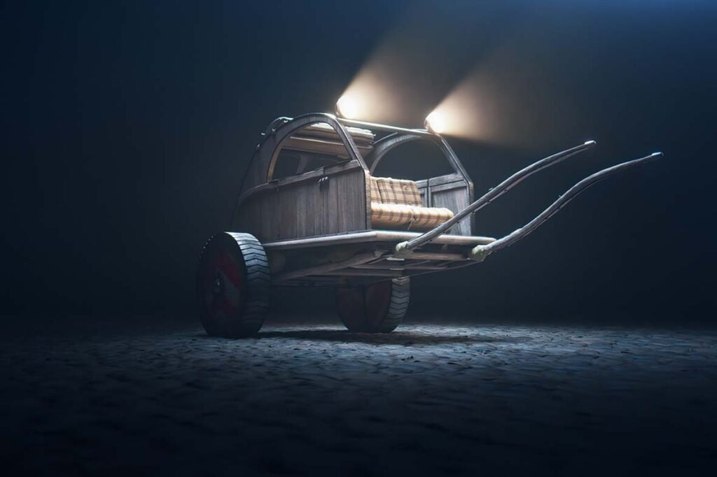 Com a sua silhueta reconhecível em todo o mundo, o 2CV faz parte do património cultural e popular de França. A ‘carruagem concept’ presente no filme “Astérix & Obélix: O Império do Meio” reformula o 2CV com referências marcantes ao universo dos heróis gauleses. As equipas de estilo da Citroën reinterpretaram, assim, os valores fundamentais da marca – conforto, tecnologia e estilo arrojado – à imagem do universo “Astérix” e deram-lhes um toque especial. O resultado é uma carruagem com linhas características, reconhecíveis por todos, suspensões feitas de estômagos de javali, um tejadilho solar, faróis inspirados nos capacetes gauleses, iluminados por pirilampos que beberam a poção mágica, e rodas feitas de escudos reciclados com os tão famosos chevrons.