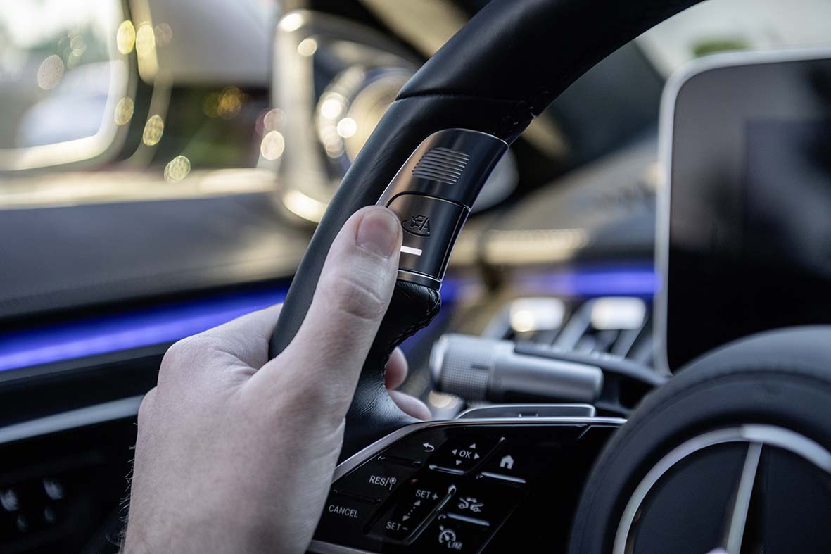 Em troços apropriados de vias rápidas e em situações de elevada densidade de trânsito, o sistema DRIVE PILOT pode assumir a tarefa de condução dinâmica, até à velocidade de 64km/h. Os botões de controlo necessários para tal estão localizados no volante, nos lados esquerdo e direito acima das cavidades do polegar. Logo que as condições sejam apropriadas, o sistema indica a disponibilidade nos botões de controlo. Quando o condutor ativa o DRIVE PILOT, o sistema controla a velocidade, a distância e conduz facilmente o veículo na sua faixa de rodagem. O perfil do percurso, os eventos que ocorrem durante o percurso e os sinais de trânsito são correspondentemente considerados. O sistema também reage perante situações de trânsito inesperadas e lida com as mesmas de forma independente, por exemplo, através de manobras de desvio na faixa de rodagem ou manobras de travagem.