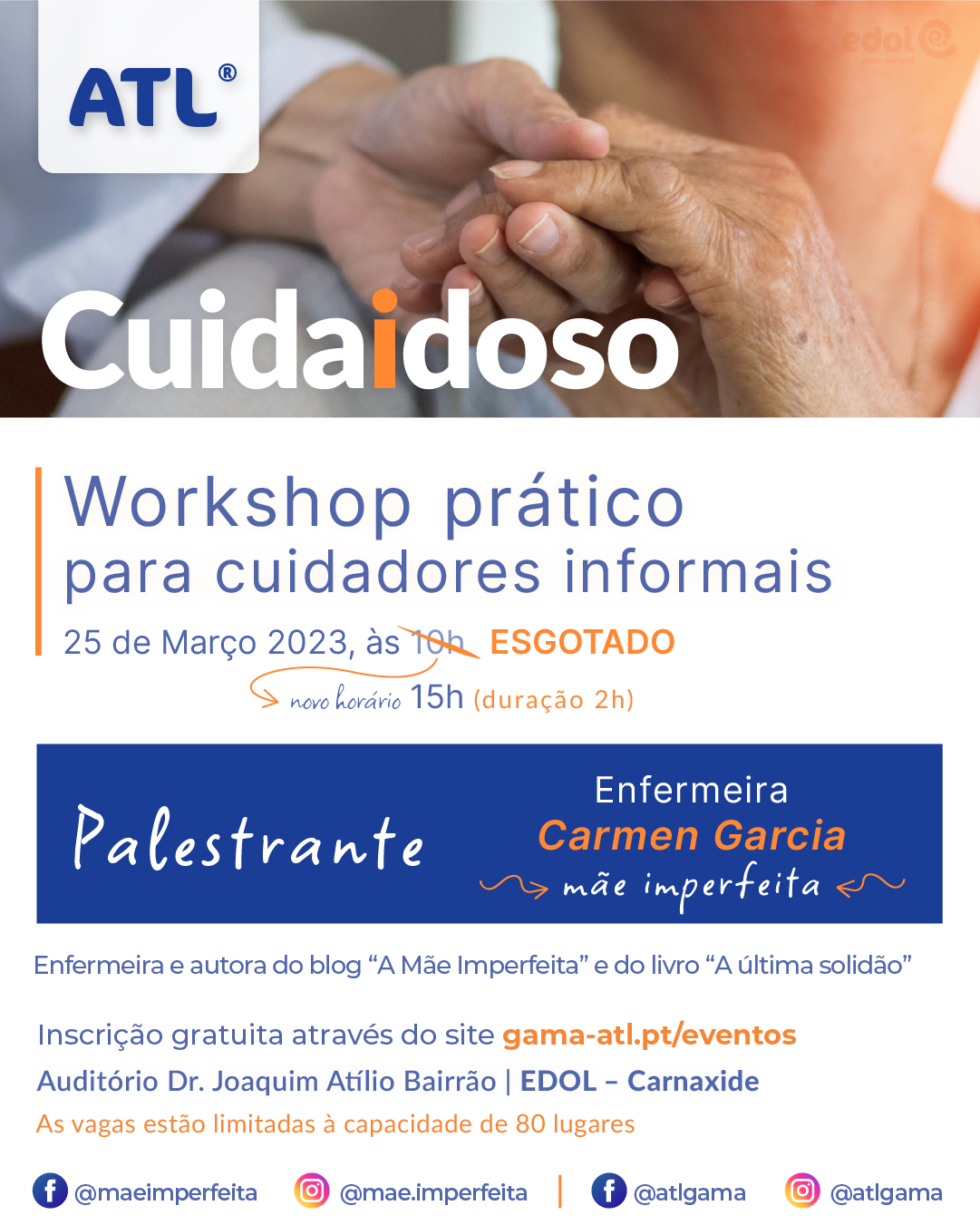 Organizada pelo laboratório EDOL, a primeira edição de “Cuidaidoso – Workshop prático para cuidadores informais” conta com a orientação de Carmen Garcia. Referência na área da geriatria, Carmen Garcia é enfermeira, influenciadora (pode acompanhá-la em “A Mãe Imperfeita”) e autora do livro “A última solidão”.