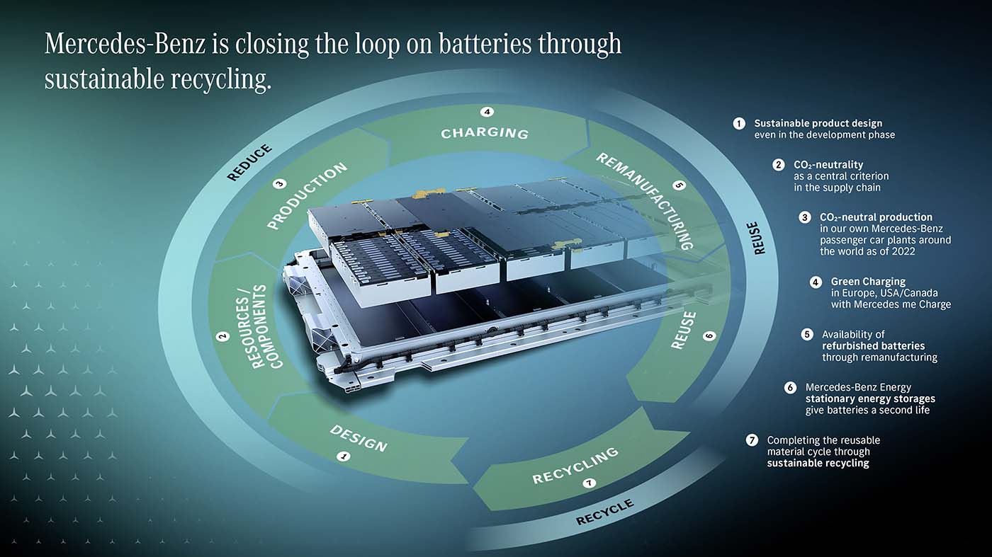 No futuro, a fábrica de reciclagem de baterias da Mercedes-Benz em Kuppenheim irá abranger todos os passos: desde o desmantelamento ao nível dos módulos, passando pela trituração e secagem, até ao processamento das matérias-primas finais para o fabrico de baterias. O processo hidrometalúrgico com uma taxa de recuperação superior a 96 % permite uma verdadeira economia circular das matérias-primas para o fabrico de baterias. A Mercedes-Benz está a cooperar com o parceiro tecnológico Primobius (consórcio entre a empresa de engenharia mecânica alemã SMS Group e a empresa australiana criadora do projeto Neometals). No âmbito do abrangente projeto de investigação científica, todo o processo de reciclagem de baterias também é considerado, onde se incluem, entre outros, o desenvolvimento dos conceitos de logística, a reciclagem sustentável das valiosas matérias-primas e a reintegração dos materiais reciclados na produção de novas baterias. Desta forma, os parceiros estão a dar um importante contributo para a expansão futura da indústria de reciclagem de baterias na Alemanha.