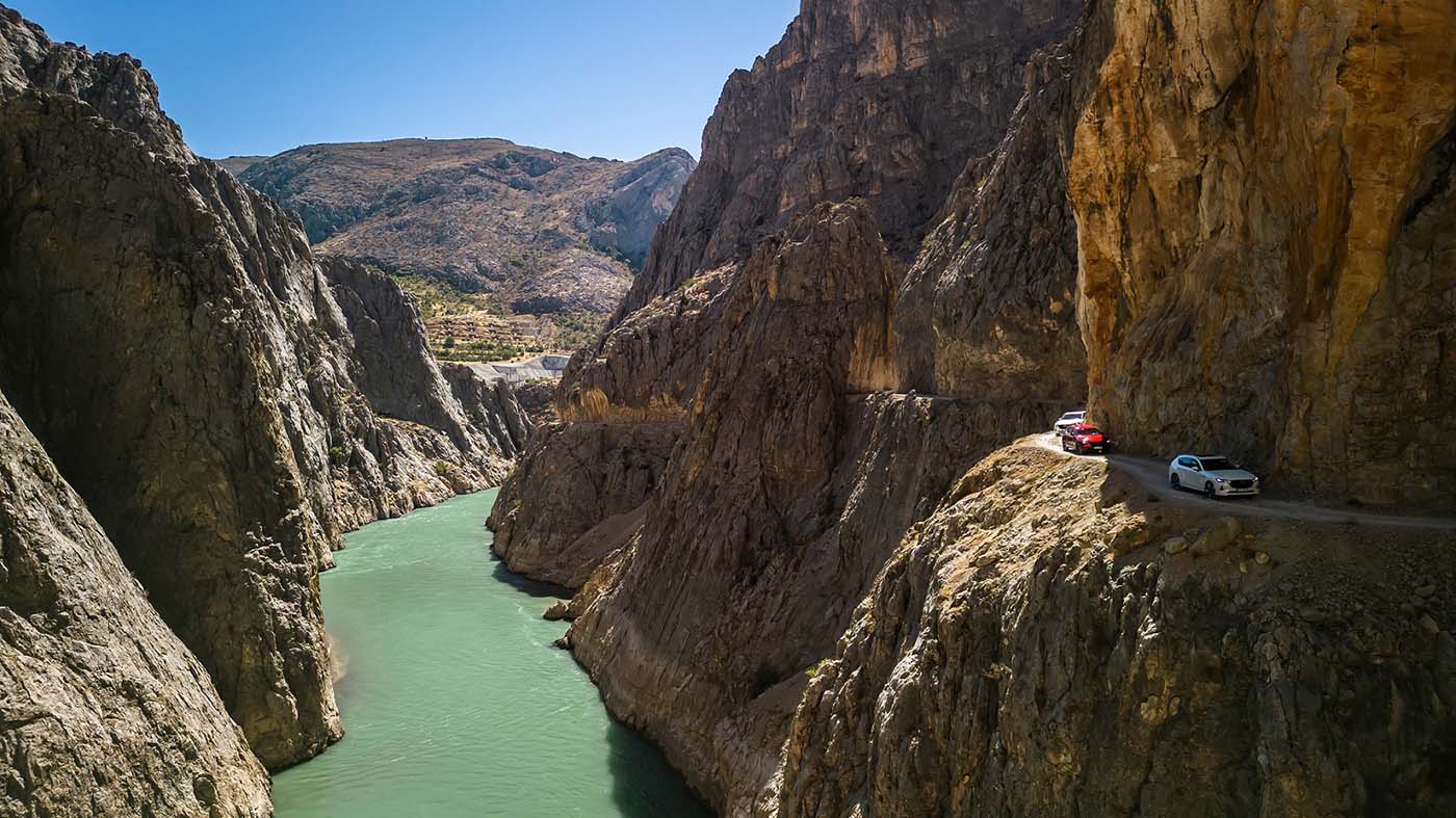 Pode não contar com as quedas vertiginosas das Curvas de Derebaşı, mas a Stone Road é desafiadora o suficiente para que tenhamos que manter as duas mãos firmemente no volante. Escarpas íngremes, por vezes verticais, estão voltadas para cima – e, ocasionalmente, sobre a própria viatura – enquanto as águas opacas do rio que corre mais abaixo são um constante lembrete do risco associado a um potencial erro.