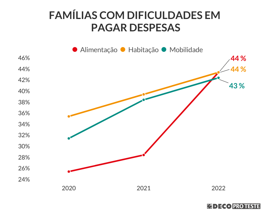 Em 2022, 44% das famílias portuguesas assumiram a dificuldade em pagar as contas com os produtos alimentares, numa tendência que se agrava desde 2020, onde as famílias em apuros eram quase metade.