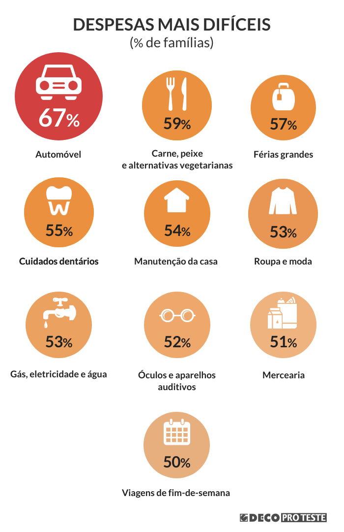 As principais parcelas que geram constrangimentos na gestão orçamental dos consumidores dizem respeito às despesas com o carro – combustíveis, manutenção e seguros (67%) –, alimentação – carne, peixe e alternativas vegetarianas (59%) –, férias grandes – viagens e estadias (57%) –, cuidados dentários (55%) e manutenção da casa – obras, remodelações (54%).