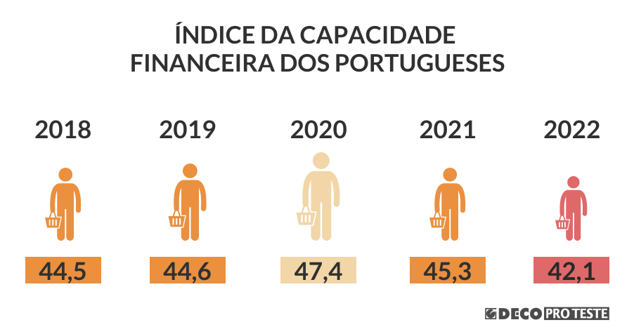 O índice que mede a capacidade financeira das famílias também não deixa espaço para dúvida: em 2022, atingiu o valor mais baixo desde há 5 anos – 42,1 (de 0 a 100; em que quanto mais elevado o número, maior a capacidade financeira para enfrentar as despesas mensais).