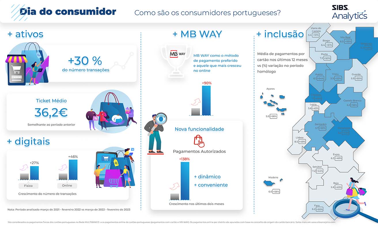 A infografia evidência o crescimento em todo o território nacional ao nível dos pagamentos online, tendo o maior número médio de pagamentos online por consumidor (considerando a proxy de cartão) nos últimos 12 meses registado um maior aumento em Lisboa (8,5 pagamentos por consumidor), Setúbal e Porto (7,2), Coimbra (7,1) e Braga (6,4). Analisando a variação entre os dois períodos em análise conclui-se que o crescimento dos pagamentos online não é exclusivo dos consumidores mais urbanos, mas está presente em todo o território nacional com os maiores crescimentos em número a registarem-se em Portalegre (+73%), Bragança (+62%), Região Autónoma da Madeira (+58%), Região Autónoma dos Açores (+58%) e Coimbra (+56%), parecendo indicar a tendência na convergência desta adoção.