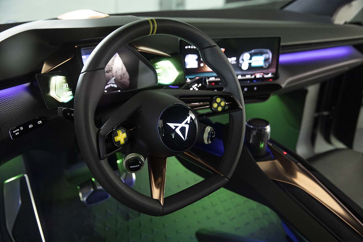 Pronto para o que o jogo comece. O elemento central que distingue o interior do CUPRA UrbanRebel Concept é o seu volante, onde os dois mundos se voltam a encontrar. “É um design inovador com um recorte arredondado no fundo, que lhe confere um visual mais desportivo. Também incorporámos botões que fazem lembrar os controlos da consola de jogos”,diz Jorge. Um interior pensado para que a condução do futuro carro elétrico urbano da CUPRA seja pura emoção ao volante.
