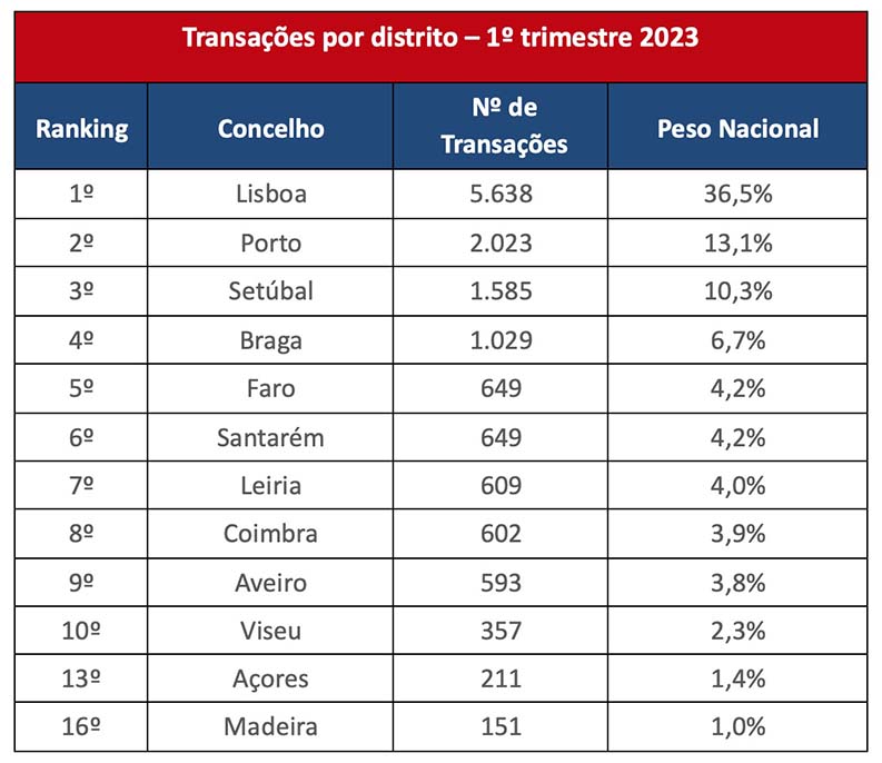 No que concerne ao número de transações negociadas por distrito neste primeiro trimestre, Lisboa continua a liderar o top 10 com um total de 5.638 transações, a que corresponde 36,5%. Seguem-se os distritos do Porto (13,1%), Setúbal (10,3%), Braga (6,7%), Faro e Santarém (4,2% cada), Leiria (4%), Coimbra (3,9%), Aveiro (3,8%) e Viseu (2,3%) – no total, os 10 distritos portugueses que representam 89% dos imóveis transacionados pela rede neste período. Destacar ainda as Ilhas, 13ª posição dos Açores e a 16ª da Madeira, com um número de transações de 211 (1,4%) e de 151 (1%), respetivamente. Em evidência ainda as Ilhas, que assinalaram um crescimento de 11% em volume de negócios.