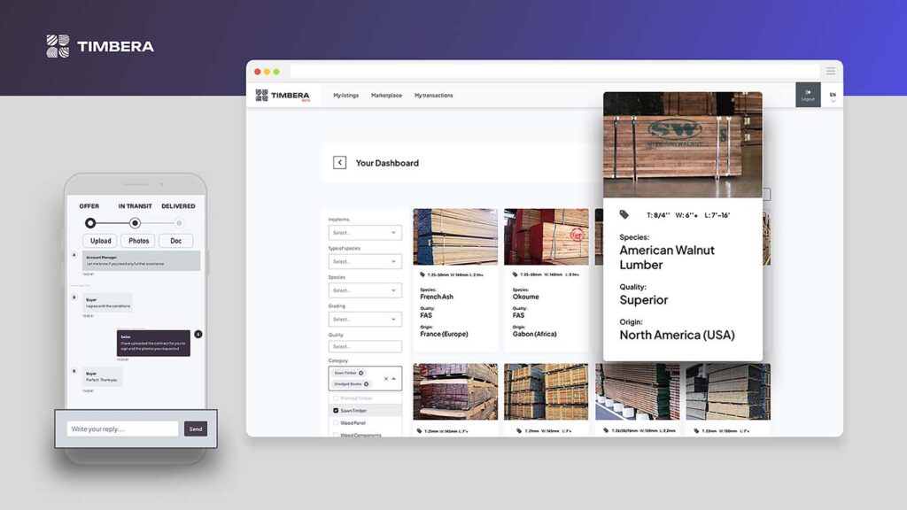 Focada em simplificar operações e ajudar os profissionais a expandirem os seus negócios, a Timbera permite aos compradores aceder a uma ampla rede de produtos e fornecedores verificados, para que possam providenciar serviços de elevada qualidade com base em transações seguras e ecologicamente responsáveis. Aos vendedores, possibilita, entre diversos benefícios, um maior alcance, assegurando visibilidade no mercado a uma escala global.