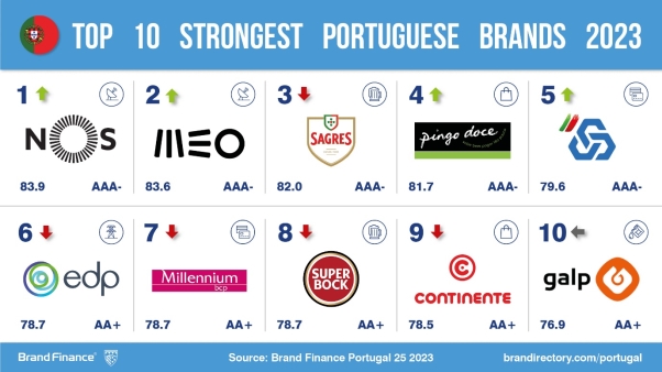 A Nos, a marca de telecomunicações, destaca-se como a marca mais forte com uma pontuação BSI de 84/100 e uma classificação AAA-.