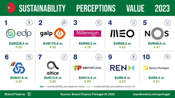 A EDP (valor da marca ligeiramente inferior em 4%, para 2,5 mil milhões de euros) obteve o valor mais elevado de perceção da sustentabilidade (SPV), com 237 milhões de euros. A maior empresa de serviços públicos de Portugal, a EDP, anunciou planos para aumentar o investimento e gastar 25 mil milhões de euros em quatro anos para quase duplicar a sua capacidade de energia renovável para 33 gigawatts até 2026. O plano estratégico para 2026 demonstra um claro empenhamento na transição energética através de um investimento acelerado e de um crescimento sustentável.