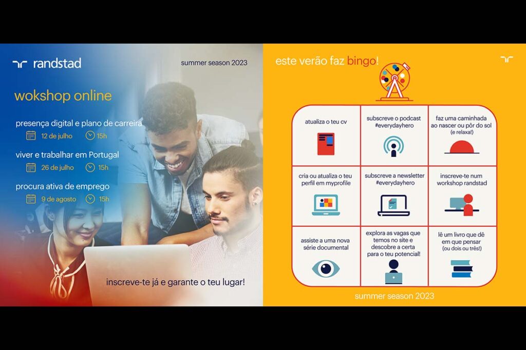 À semelhança das edições anteriores, o programa de verão da Randstad é composto por várias atividades e dinâmicas que pretendem acrescentar valor informativo aos candidatos, para que possam explorar e elevar as suas potencialidades. Este ano, o programa traz uma novidade. Com o mote: “Este verão faz bingo”, a Randstad criou um cartão, com várias atividades para preencher, que incluem atualizar o currículo; a inscrição num workshop; a subscrição do podcast #everydayhero. Para quem completar o cartão, a Randstad terá um prémio surpresa.