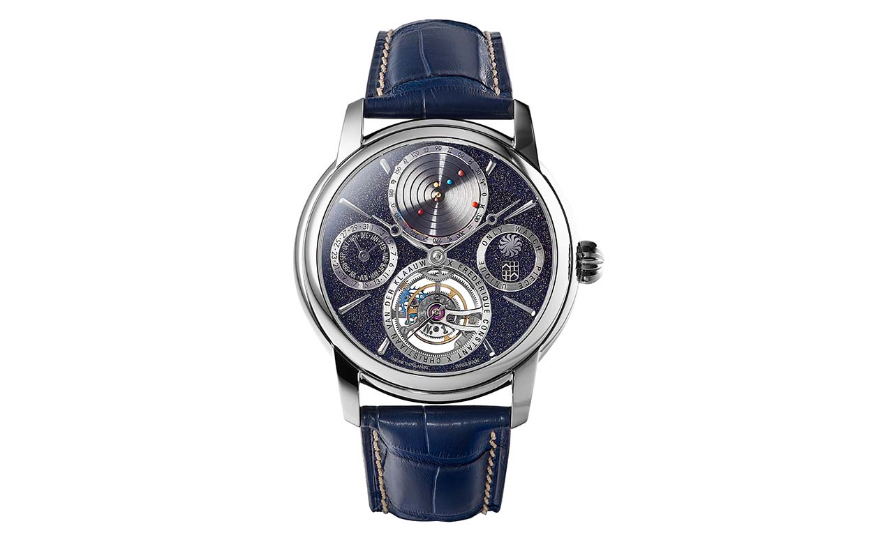 O Tourbillon Planetarium Only Watch 2023 não esconde nada: a peça exibe com orgulho as duas principais complicações no fundo cósmico do mostrador aventurina. O planetário desenhado por Christiaan van der Klaauw ocupa um lugar privilegiado às 12 horas. Foi o próprio Christiaan van der Klaauw que criou o primeiro modelo há mais de 40 anos, em 1982, antes de o produzir em miniatura para um relógio em 1999. Desde então, a empresa tornou-se especialista em produzir relógios com complicações astronómicas, aperfeiçoando constantemente o planetário até chegar à versão agora apresentada, que continua a ser o planetário mecânico mais pequeno do mundo.