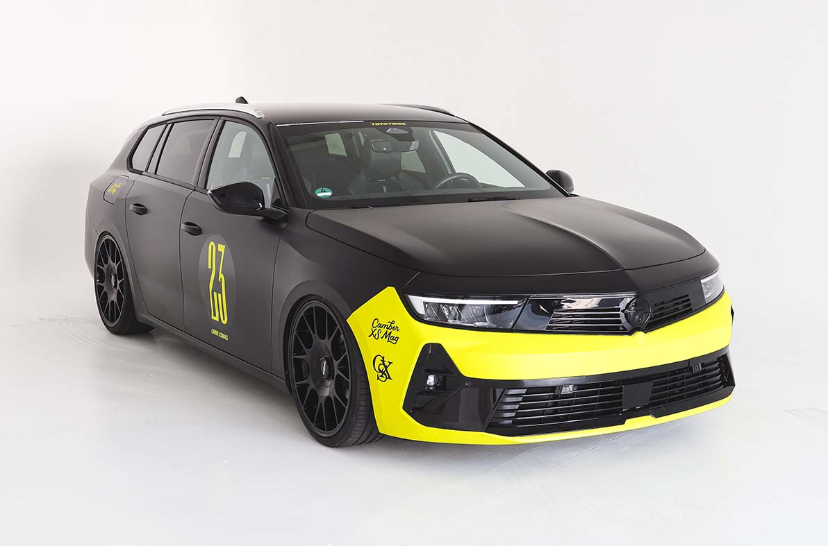 Os especialistas da XS Carnight também se ocuparam do Opel Astra Sports Tourer GSe e apresentaram o modelo ao público no fim de semana. Graças à sua designação específica (GSe significa “Grand Sport electric”), o dinâmico modelo de topo da família Astra deixa bem claro o que dele se pode esperar: 165 kW/225 cv de potência do sistema (consumo de combustível de acordo com a norma WLTP[1]: 1,2-1,1 l /100 km, emissões de CO2 26-25 g/km; ambos valores combinados), binário máximo de 360 Nm e um chassis específico 10 milímetros mais baixo, asseguram um puro prazer de condução mesmo na versão de série e, graças à propulsão híbrida plug-in, também sem emissões locais. A “Carstyle me”, empresa de transformação de automóveis (tuning), instalou também a suspensão pneumática “GRINDS”. A station wagon com design XS também foi alvo de imensa atenção graças às suas jantes especiais de 20 polegadas, fornecidas pelo fabricante americano “ROTIFORM” e, obviamente, aos autocolantes específicos XS.