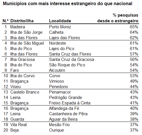 Existem um total de 10 localidades em Portugal onde a maioria das pesquisas de casa para comprar ou arrendar provém do estrangeiro, superando as pesquisas nacionais. A maior diferença de interesse acontece em Porto Moniz, na Madeira, onde 65% das visitas aos anúncios de habitação são feitas por estrangeiros. Em seguida, encontra-se Calheta (ilha de São Jorge) com 64%, Lajes das Flores (ilha das Flores) com 62%, Nordeste (ilha de São Miguel) com 61% e Lajes do Pico (ilha do Pico (61%).