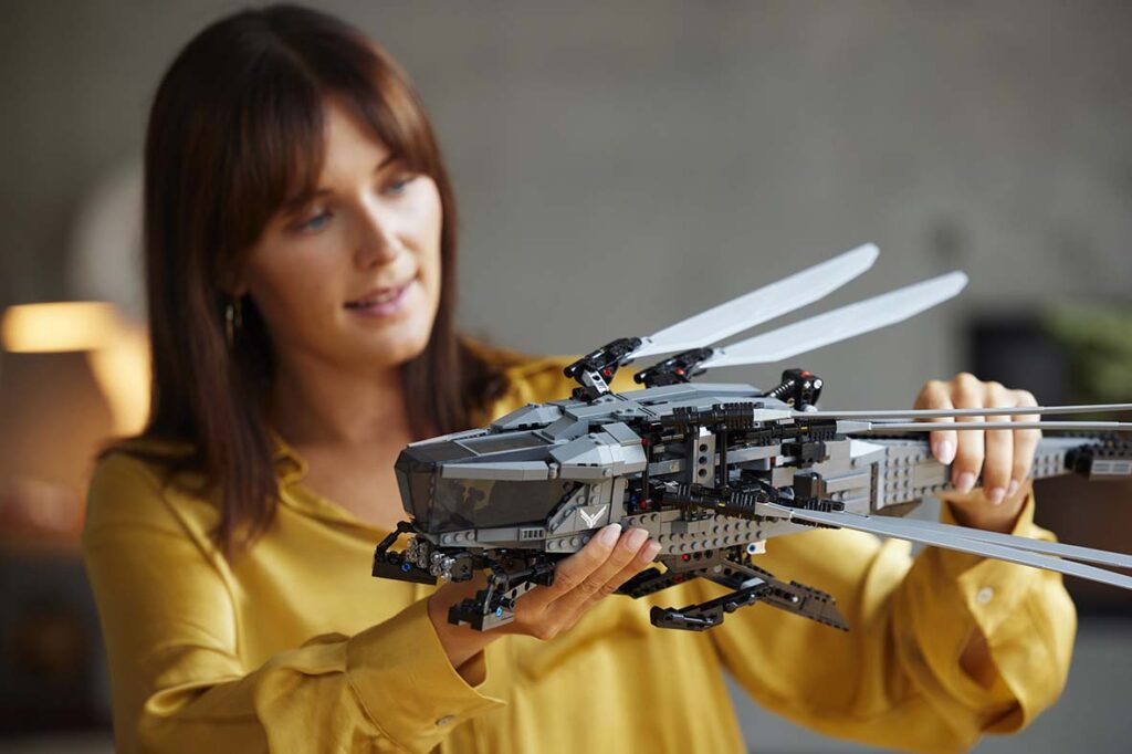 «Tal qual os fãs mundo fora, ficámos completamente maravilhados quando o épico Dune se estreou — pelo que o nosso regresso a Arakkis em Dune: Part Two foi a oportunidade perfeita para dar vida a esta icónica nave em forma de tijolos LEGO», afirmouMichael Psiaki, Design Master no Grupo LEGO. «Os construtores podem agora recriar esta impressionante nave com pormenores incríveis, seja para a expor orgulhosamente ou recriar em casa as cenas favoritas da épica saga de Dune.»