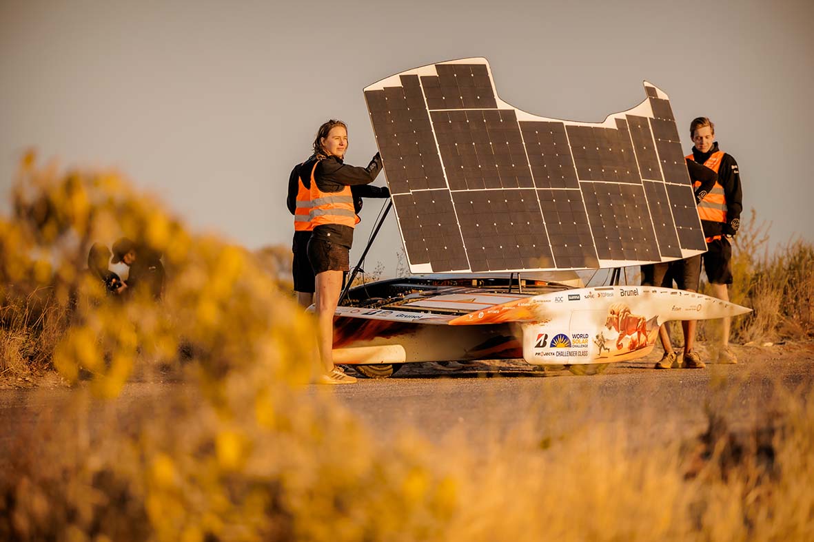 Dedicação máxima. Os membros holandeses da equipa Brunel Solar Team passaram mais de um ano a pôr em prática todos os seus conhecimentos para participar no World Solar Challenge. O resultado é o Nuna 12, um carro elétrico com a forma de uma asa, feito de materiais leves e coberto com painéis solares: “Apresenta as tecnologias mais recentes no domínio das células solares e dos sistemas de baterias”, afirmou Tijn van Weel, um dos membros da Brunel Solar Team. Durante o evento, os concorrentes tiveram de se levantar cedo para carregar o veículo, a partir das 5h, aproveitando os primeiros raios de sol, até às 8h, quando a corrida recomeçou. A partir daí, percorriam cerca de 700 km por dia, passando pelos pontos de controlo pré-determinados, até às 17 horas, altura em que paravam e preparavam os carros para o dia seguinte.