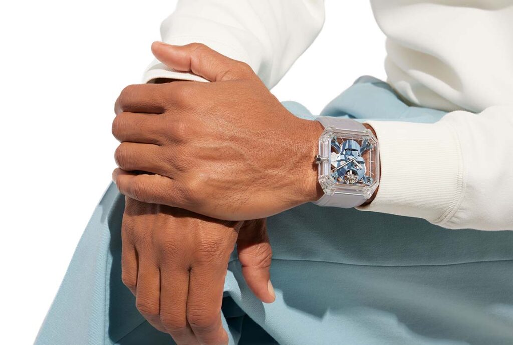 Para expressar todo o poder fascinante do crânio, a Bell & Ross optou por colocá-lo numa caixa de 45 mm, resistente à água até 30 metros e completamente transparente, incluindo a parte traseira. Esta caixa é feita de safira, um material compósito de alta tecnologia quase tão duro e resistente a riscos como o diamante. O design deste tipo específico de corindo é muito complexo. A sua transparência impecável pressupõe a ausência de impurezas. A sua produção, que requer o aquecimento de pó de alumínio fundido com chama de hidrogénio a uma temperatura superior a 2.000°C, é extremamente delicada. A transparência é também uma forma de expor o conhecimento contemporâneo da alta relojoaria. Para garantir uma estética global perfeitamente consistente no pulso, a Bell & Ross equipou o relógio com uma pulseira de silicone macio e translúcido, fechada por uma fivela de aço polido e acetinado. Uma edição limitada de apenas 25 peças, o novo BR 01 CYBER SKULL SAPPHIRE ICE BLUE é uma peça de alta exclusividade por natureza.
