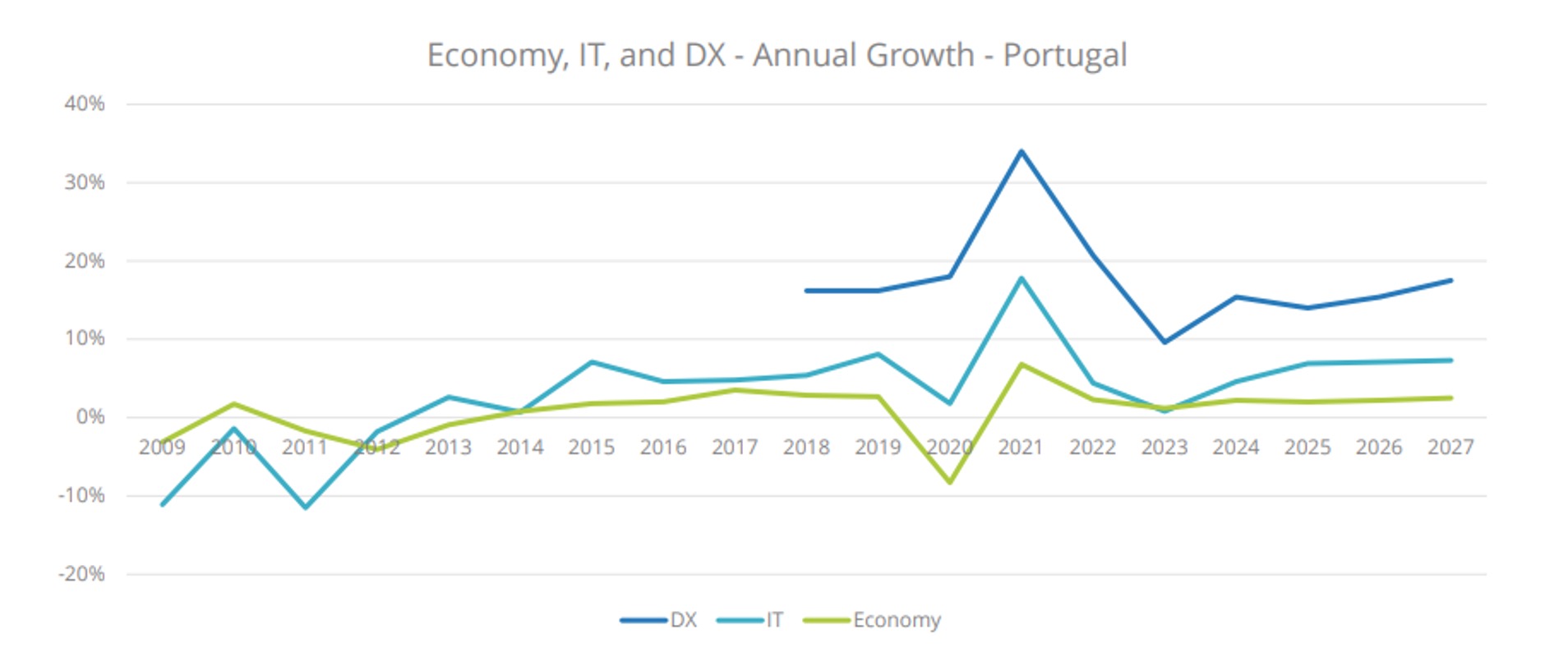 De notar que o crescimento esperado para 2024 fica abaixo de 2021 e 2022, períodos em que o investimento em transformação digital (DX) se situou em 34% e 21%, respetivamente. Porém, já no ano passado, a IDC verificou que este crescimento desacelerou para 10%.