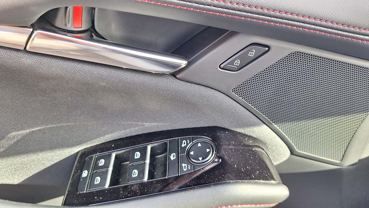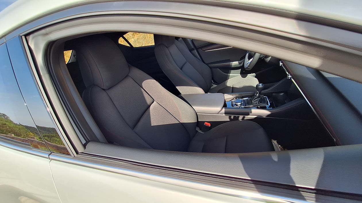 No interior, o ambiente é envolvente e pensado ao detalhe. Os bancos em tecido preto com costuras em vermelho acrescentam um toque desportivo sem comprometer o conforto. A posição de condução é ergonómica, os materiais transmitem qualidade ao toque e os comandos estão dispostos de forma intuitiva, como é habitual na Mazda.