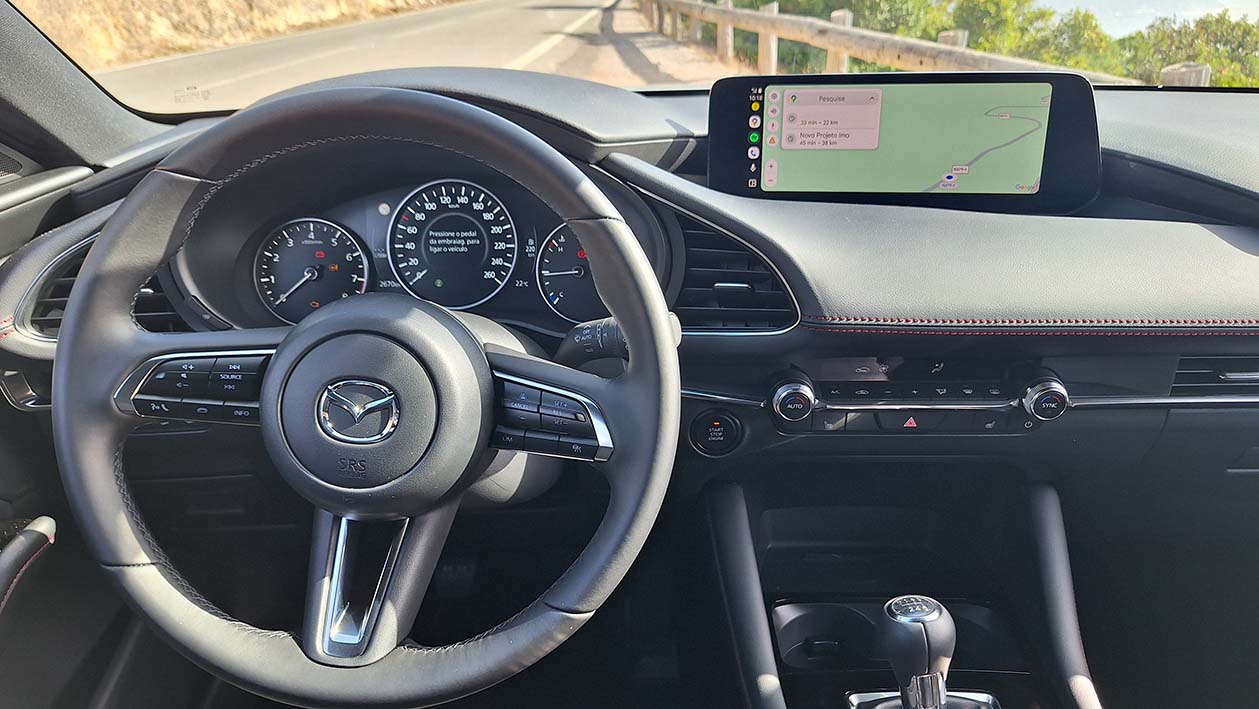 No campo da tecnologia, o Mazda 3 está bem equipado com um sistema de infotainment intuitivo, ecrã central com boa definição, integração com Apple CarPlay e Android Auto e comandos acessíveis através do botão rotativo. A instrumentação é clara e combina elementos digitais com apontamentos analógicos, reforçando a estética premium do habitáculo.
