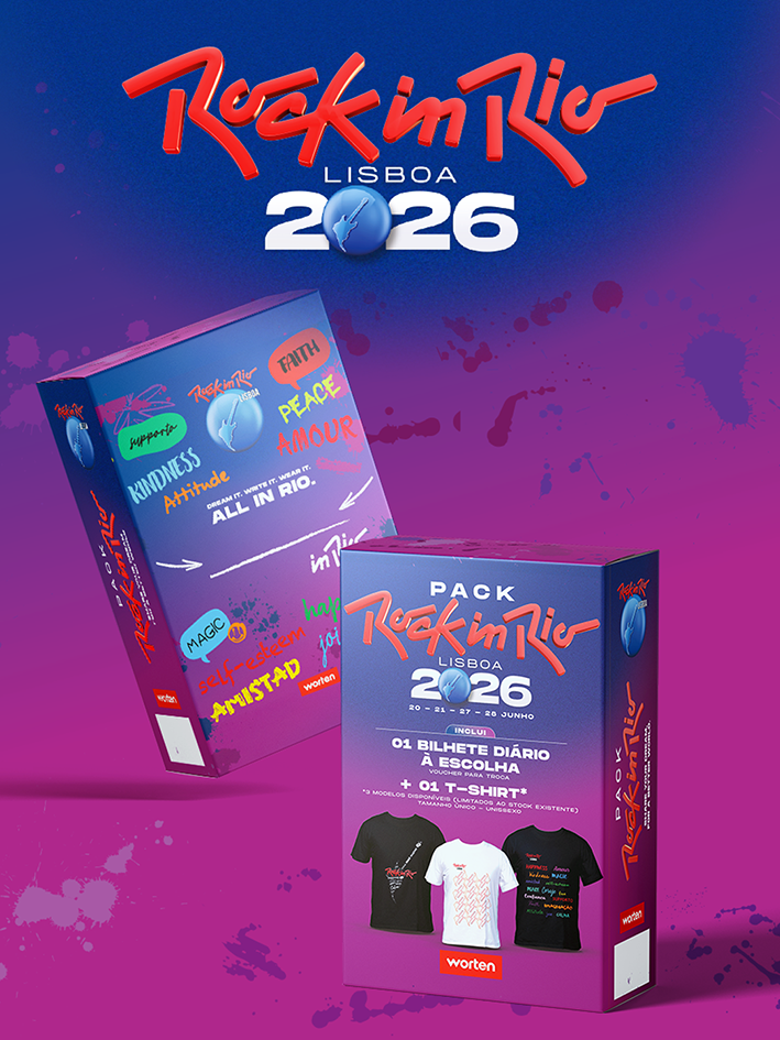 Mais do que um bilhete, o Pack Rock in Rio x Worten é uma forma de vestir a camisola do festival – literalmente. O pack inclui um voucher, que pode ser trocado por um bilhete diário à escolha para qualquer dia do evento (20, 21, 27 ou 28 de junho), e uma t-shirt exclusiva alusiva ao Rock in Rio Lisboa 2026, disponível em três modelos, para que cada fã possa celebrar a música antes mesmo de chegar à Cidade do Rock.