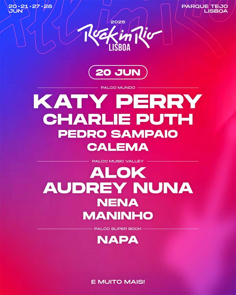 Este anúncio reúne cinco artistas e cinco universos sonoros distintos, que se cruzam na mesma energia, diversidade e emoção, numa curadoria pensada ao detalhe, refletindo a essência do Rock in Rio Lisboa como ponto de encontro entre géneros, culturas e gerações. A 20 de junho, o dia mais pop da 11.ª edição do festival em Portugal promete muita animação, com atuações já confirmadas de Katy Perry, uma das maiores superestrelas globais e conhecida pelos seus espetáculos cheios de cor e emoção, ao lado da energia contagiante de Pedro Sampaio, do romantismo e ligação às raízes dos Calema e da frescura portuguesa dos NAPA.