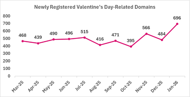 Entre março e dezembro de 2025, foram registados, em média, 474 novos domínios relacionados com o Dia dos Namorados por mês. No entanto, em janeiro de 2026, esse número subiu para 696, o que representa um aumento de 44%. Apenas nos primeiros cinco dias de fevereiro, foram detetados mais 152 novos domínios, um crescimento adicional de 36% na média diária face a janeiro.