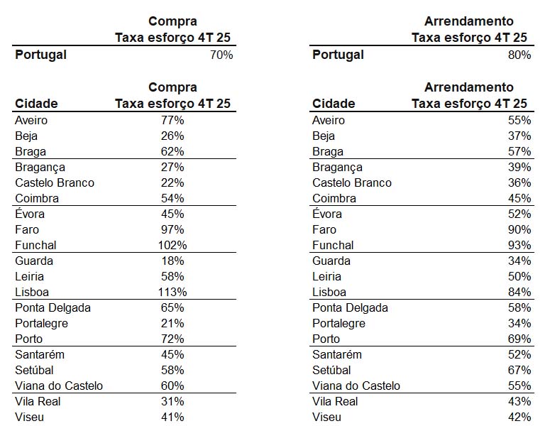 Por outro lado, apenas algumas capitais de distrito apresentam taxas de esforço iguais ou inferiores ao limite recomendado de 33%. É o caso da Guarda (18%), Portalegre (21%), Castelo Branco (22%), Beja (26%), Bragança (27%) e Vila Real (31%), que se mantêm como os mercados relativamente mais acessíveis para adquirir habitação.