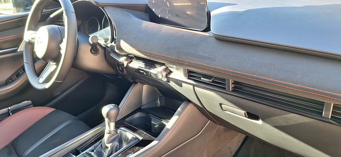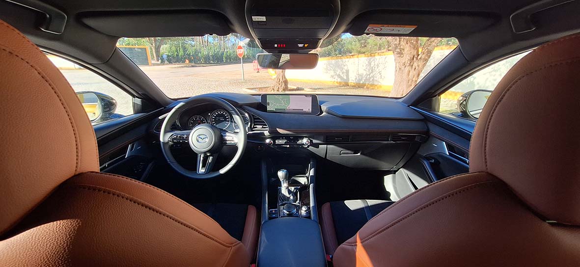 Ergonomicamente, o Mazda3 continua exemplar. A posição de condução é baixa, envolvente e centrada no condutor. O desenho do tablier privilegia horizontalidade e limpeza visual, reduzindo distrações. O sistema de infotainment mantém a lógica de comando por botão rotativo — uma solução que continua a ser mais intuitiva e menos intrusiva do que muitos ecrãs táteis do segmento.